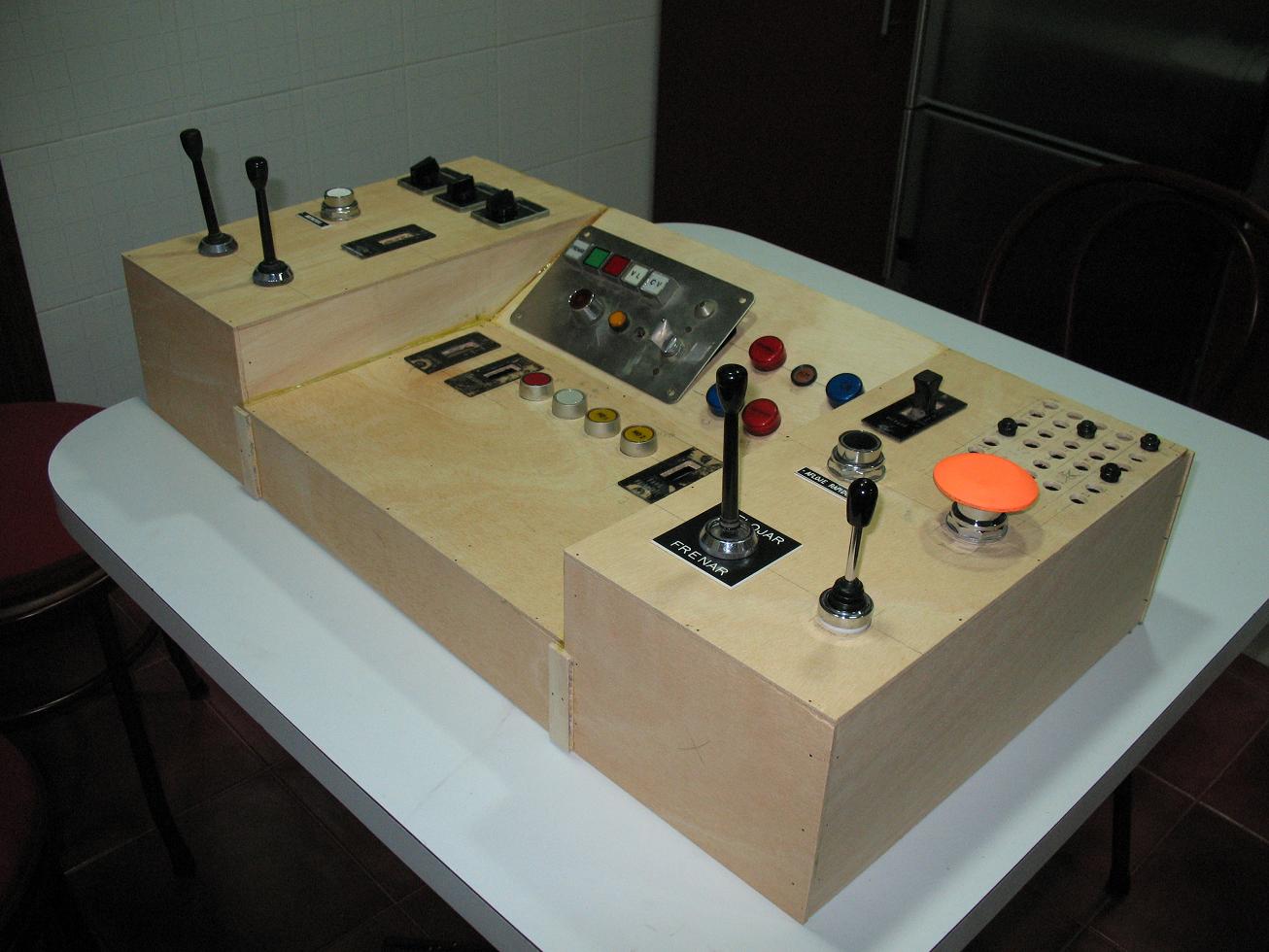 En las fotos que adjunto falta pintura, pulsadores pequeños de la parte derecha y casi todos los interruptores como el del silbato, que si que esta puesto. El resto falta por poner, porque me faltan hacer los agujeros de sujección. Una vez pintado, haré los cartelitos para cada cosa, y lo más importante, el cableado, que es una de las cosas que mas cuesta, pero como ya tengo la base de la otra cabina que hice, ya no me tengo que comerme el coco y solo tengo que conectar cada cable en su sitio.
