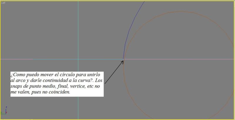 a) ¿Existe alguna forma de desplazar el círculo para que me quede unido al arco y no halla ese espacio?. En AutoCAD es fácil usando la Referencia a objetos/Intersección ficticia. Quizá en Max pueda usar algún Snap determinado, pero agradecería consejos. Ver imagen.