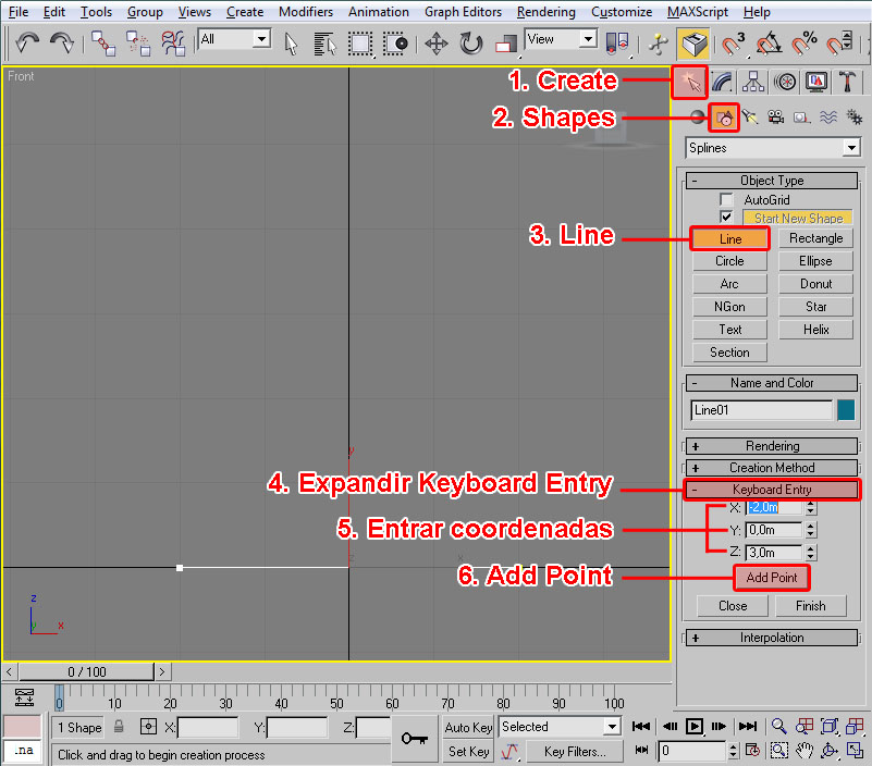 También veo que podré decidir si deseo visualizar el modelo con las superficies cerradas e iluminadas (Smooth + Highlights), o solo el armazón de aristas del modelo (Wireframe). Esto me da una cierta comodidad, pues empiezo a poder decidir en parte la manera en que trabajaré con el 3ds Max.