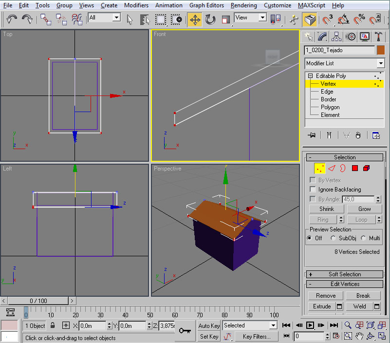 Con esto ya tenemos preparado el material para nuestra casilla, con su textura y su configuración de iluminación. Ahora la pregunta que nos surge es ¿cómo le aplico el material al modelo? En primer lugar deberemos tener seleccionado el/los elemento/s a los cuales vamos a asignar dicho material. Como en nuestro caso serán todos los objetos de la casilla nos bastará seleccionarlos con "Control" + "A". Un vez realizado esto tendremos varias maneras (como suele ser común en 3ds por lo que vamos viendo) de llevar a cabo la asignación: