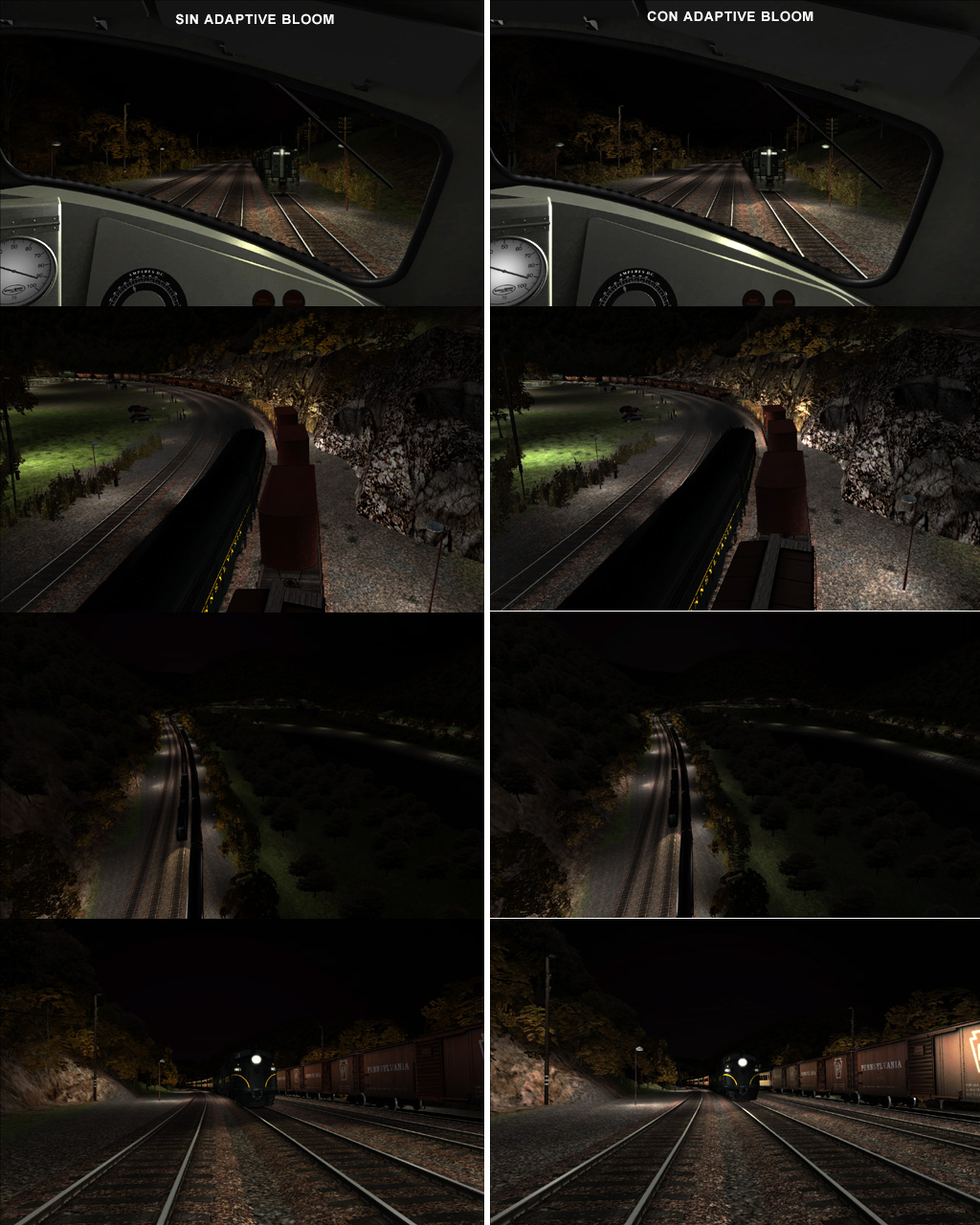 Normalmente activo el anti-aliasing nivel 6 (SSAA2x2), aunque en Horseshoe por la noche debo bajar al nivel 3 (LLAA+MSAAx8). En esta ruta, por la noche, los cálculos de la luz (creo que en las traviesas) frenan considerablemente la fluidez del juego.
