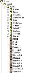 Esta nueva jerarquía tiene muchos menos grupos (son los elementos que más comen recursos en el Rail Simulator), y estos están agrupados según nuestra conveniencia para establecer los LODs del objeto. Las piezas que siempre estarán a la vista (caja, techo, etc) están directamente bajo el grupo Import que define el vagón, o sea, estarán sujetas a la distanciade visión del propio vagón. El resto de piezas están bajo diferentes grupos.
