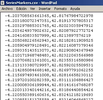 Una vez eliminadas con Excel las demás columnas, se guarda el fichero como SeriesMarkers.csv y se trata con el WordPad de forma parecida a como se ha hecho con los Series, para eliminar los valores “coma cero” (,0) que se observan al final de cada línea y que sobran.