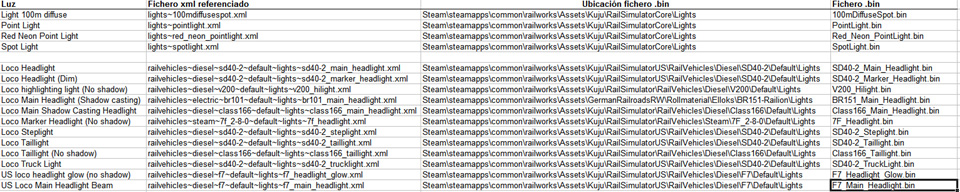 En la actualización del core de RW3 (v10.9 en febrero de 2012, válido para la versión actual, la v11.0b), la tabla de luces es la siguiente (clic para agrandar):