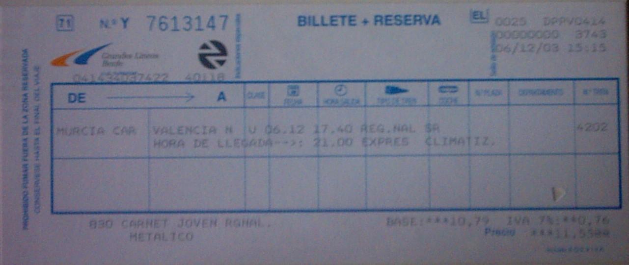 como contestacion a entfe 001 (a pesar de que das por cerrado el tema), nadie te ha aclarado la diferencia de formato entre el de la boda y el que pones que se acerca a la proporcion aurea (o como yo le llamo proporcion e-u-r-o pues ves que se asemeja mucho, incluso digo que si el ancho internacional de via es el europeo, el de fenfe es el ancho euro 1.6 y pico como el euro y el aureo). bueno , a lo del billete: Efectivamente en cataluña el sistema de billetaje de renfe se ha adaptado al que tenia TMB para compatibilizarlo con las lectoras, en cambio en Madrid, se adapto al formato que tenia historicamente la compañia del metro, y que siguio utilizando cuando en 1975 se introdujo el sistema de lectura magnetico, que es un formato raiz de 5, (que es para los que no esten familiarizados con los formatos es aquel que dividido en 5 partes iguales (trasversalmente) obtenemos 5 formatos tambien raiz de 5) en concreto su parte mas estrecha es de 30 mm., por consiguiente la larga es de 67 mm.