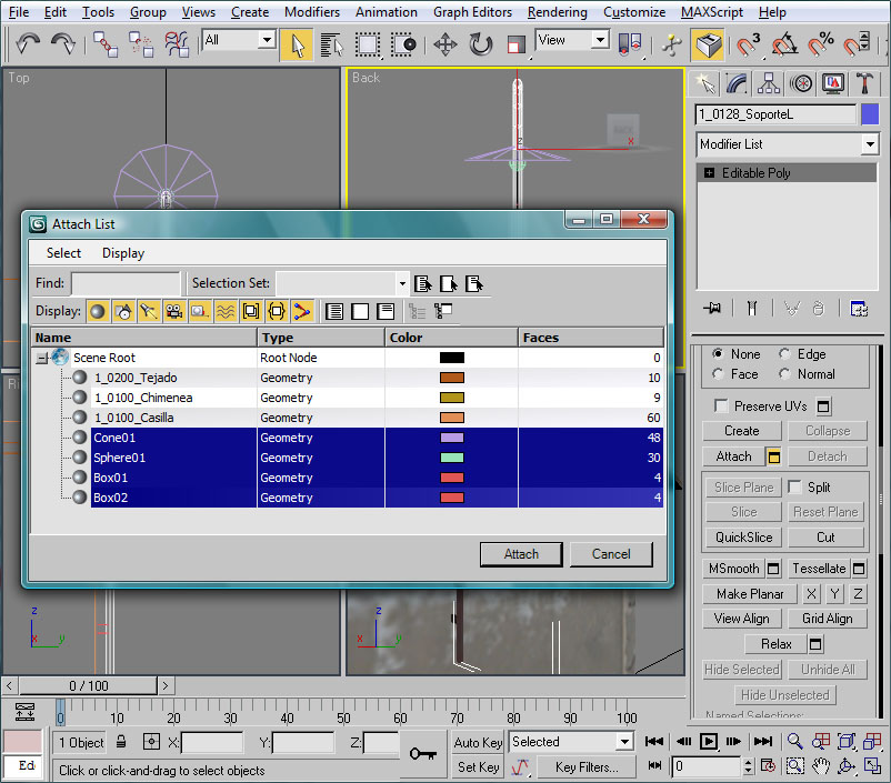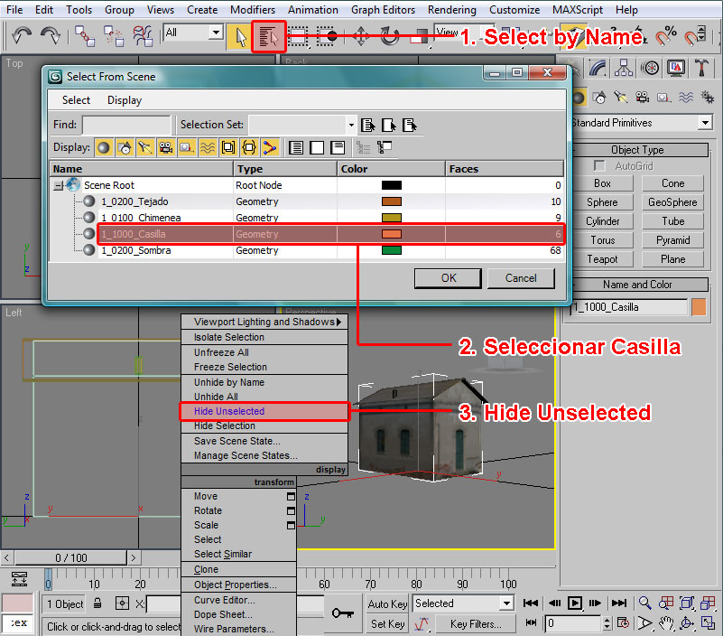 Ahora que ya tenemos los dos elementos de la casilla para sus respectivos LODs, ocultaremos, tal como hemos hecho antes, el LOD lejano 2_1250_Casilla, dado que este elemento ya tiene la malla que queremos. Nos dejaremos visible el LOD cercano 1_0128_Casilla para trabajar en él e incrementar su detalle como corresponde a su visión de cerca.