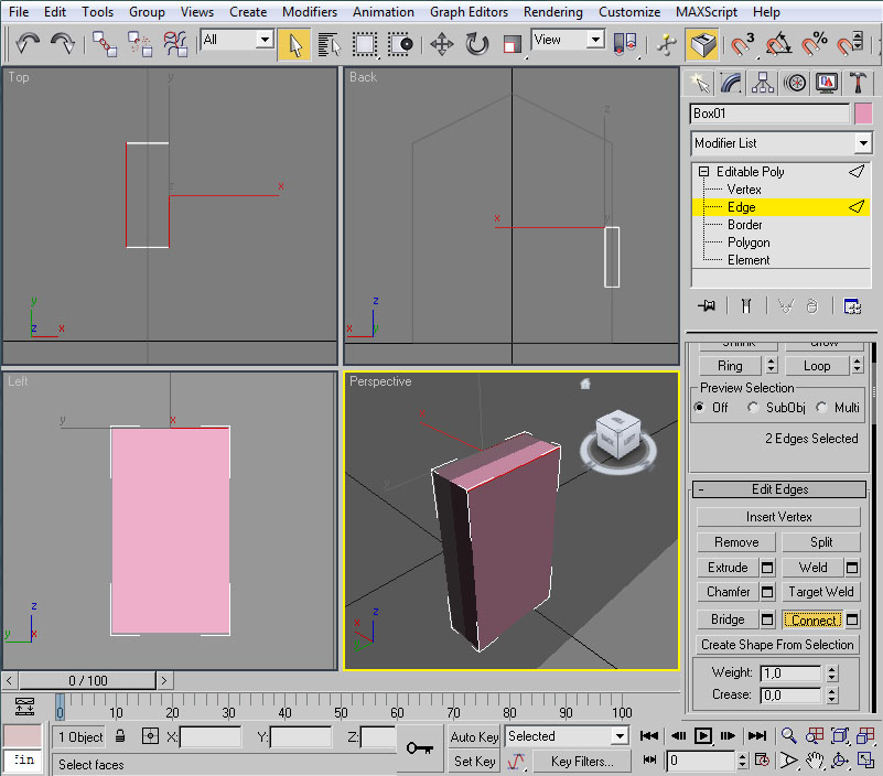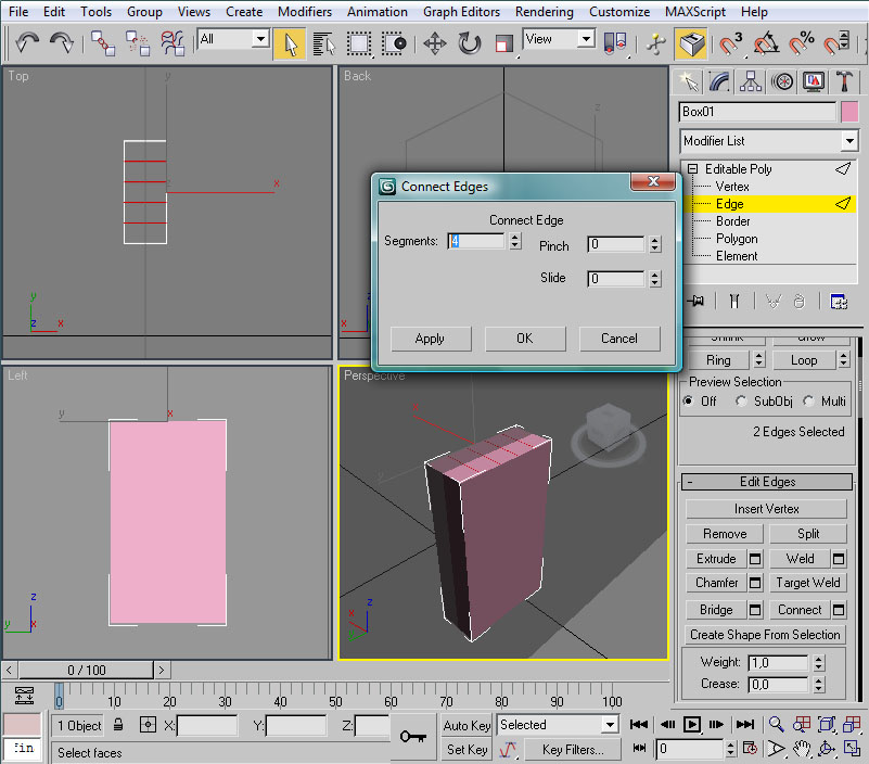 Con ambas aristas seleccionadas buscaremos el botón "Connect" en el Command Panel, bajo el apartado "Edit Edges", y pulsaremos sobre el pequeño icono que tiene adosado, para que nos solicite los parámetros de "conexión" de las aristas. Este comando crea aristas que conectan las seleccionadas. En la ventana que nos aparece informaremos que queremos 4 segmentos (nuevas aristas) y aceptaremos.