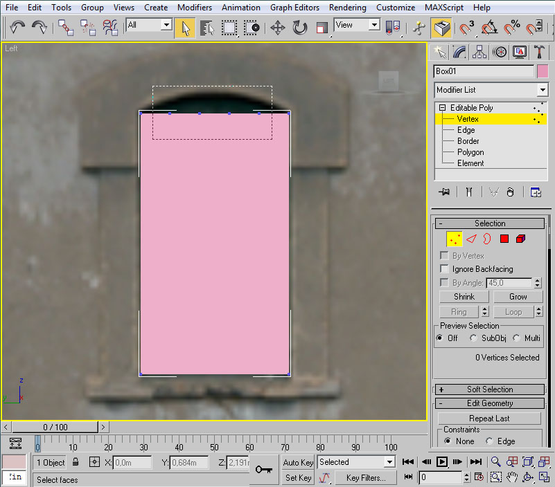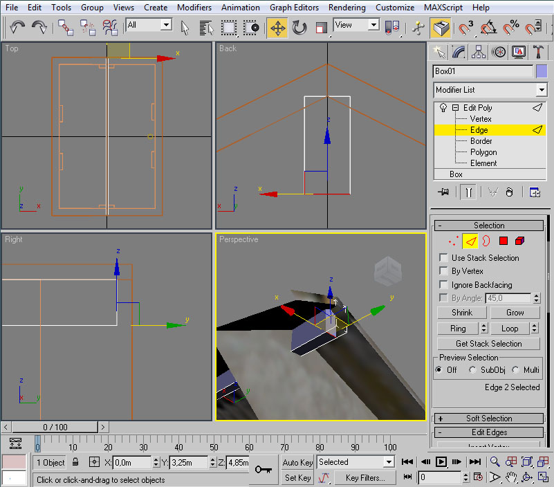 Iremos a la vista en perspectiva, donde centraremos la ventana y el cubo. Como éste último está situado "sobre la pared", con la casilla seleccionada pulsaremos las teclas "Alt" + "X", con el fin de volver temporalmente semi-transparente la casilla y así ver en su totalidad el cubo sobre el que vamos a trabajar. En esta situación, convertiremos el cubo en "Editable Poly", pasaremos a modo aristas ("Edge") y seleccionaremos, de las aristas superiores, las anterior y posterior respecto al lado largo del cubo (las señaladas en rojo en la imagen):