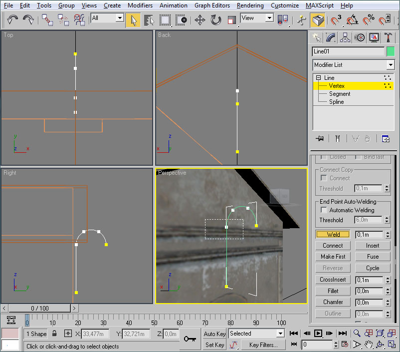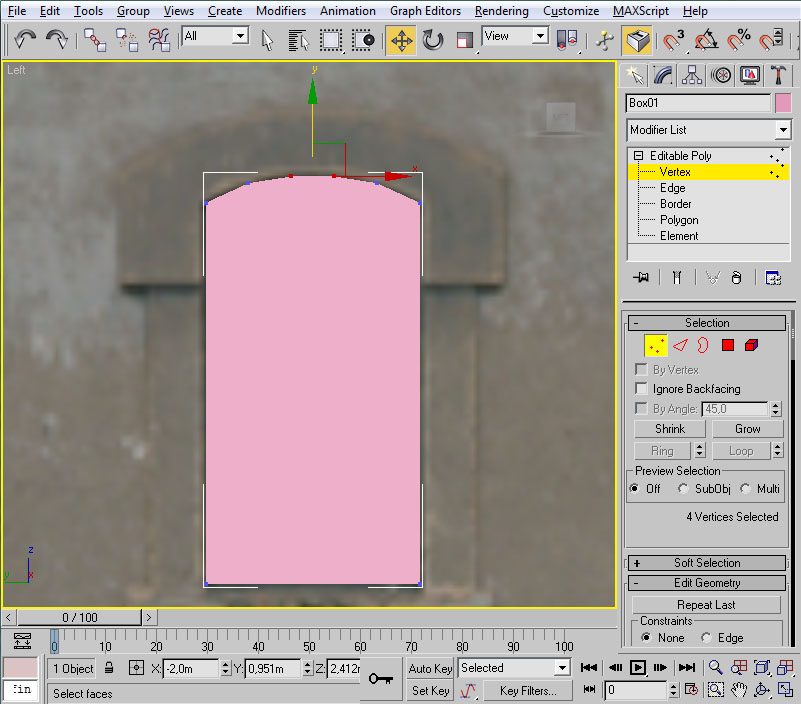 Y mediante "Select and Move" los desplazaremos hacia arriba, usando la flecha verde, hasta que se ajusten al contorno del arco de la ventana: