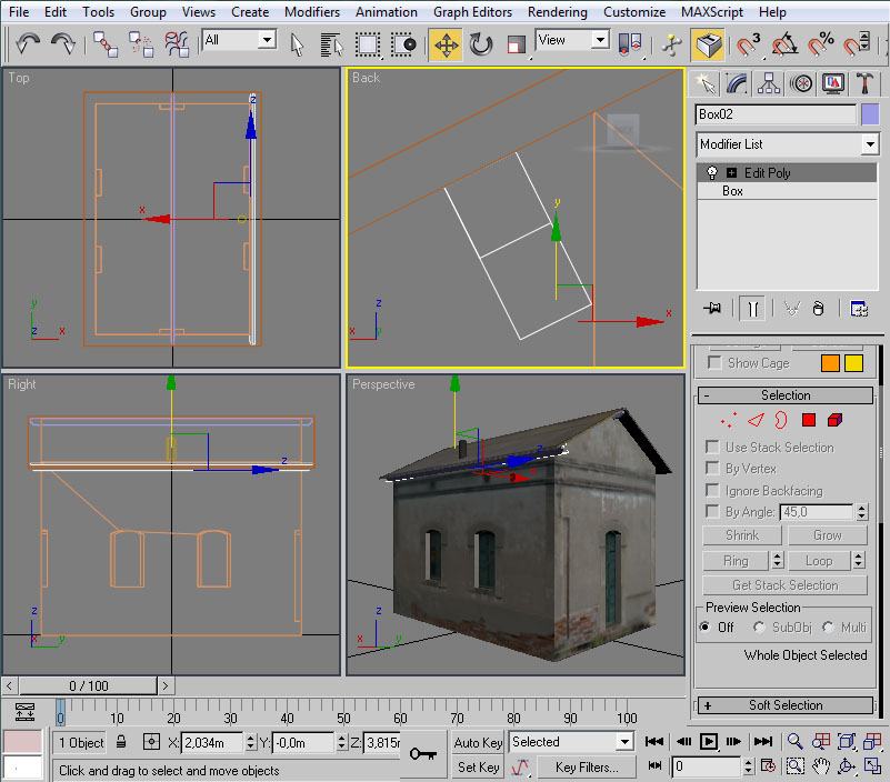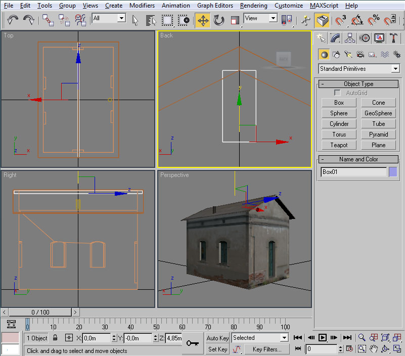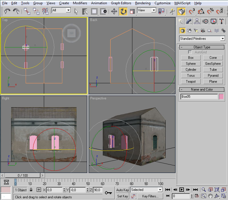 Desplazaremos el cubo hasta la posición de la ventana. Esto lo podemos hacer mediante "Select and Move" y, en la vista lateral, pinchando con el ratón sobre las dos flechas, verde y roja, que aparecen sobre el "pivot" del cubo.