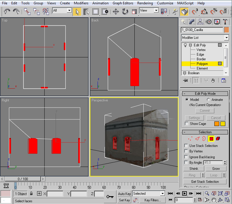 En primer lugar, como la casilla la vamos a moldear mediante operaciones booleanas para "ahuecar" ciertas partes de sus fachadas, es necesario que sea un objeto "cerrado" en su totalidad. Esto no es así porque en su momento eliminamos el polígono inferior de la casilla (como ejemplo de aligeramiento de polígonos de las piezas), por tanto, y en esta ocasión, en primer lugar deberemos volver a crear un polígono en la base de la casilla que nos "cierre" la forma geométrica de la misma.