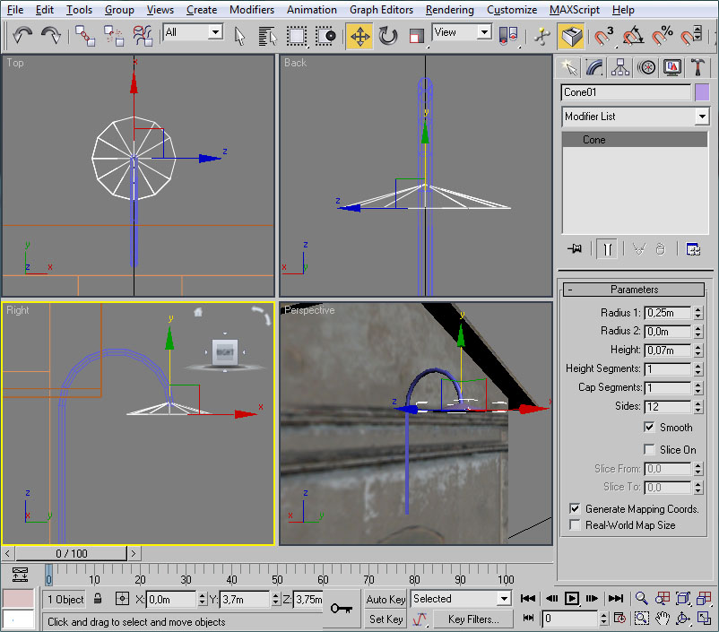 Un cono invertido de 0,125 m de altura y 0,1 m de diámetro mayor. Está texturado con el archivo "Gizmo_noaplha.ace", que se halla en el subdirectorio Textures, y que le da esos colores amarillo y rojo. Esta especie de trompeta no es en realidad importante para el resultado final, puesto que no se visualizará en el simulador, es únicamente la manera para que el Asset Editor nos permita "ver" el punto de salida del efecto de humo, para poder ubicar, de esta forma, el efecto sobre el modelo. Podríamos modelar cualquier otra forma y colores, pero no variarán el resultado en el simulador, por tanto nos quedaremos con ésta, que es el "shape" por defecto que usan las creaciones de Kuju.
