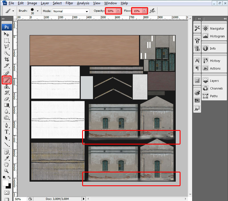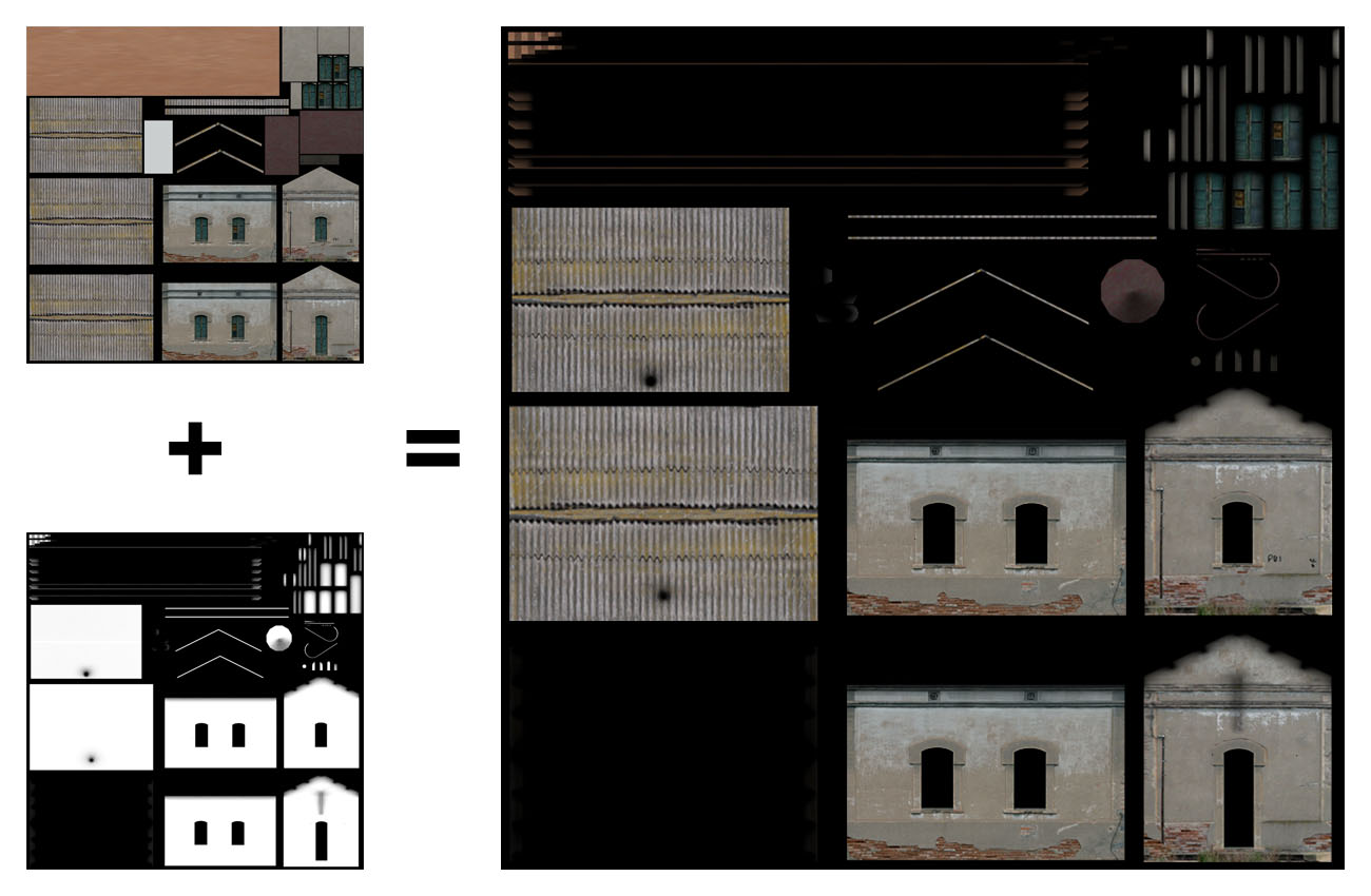 Está dividido en una matriz de 4x4 (la matriz podría ser de otras dimensiones) que permite tener 16 texturas diferentes para el humo, aunque en este caso, por simplicidad, la textura es la misma en todas las ocasiones. Además incorpora un canal alpha para dar semitransparencia a la textura:
