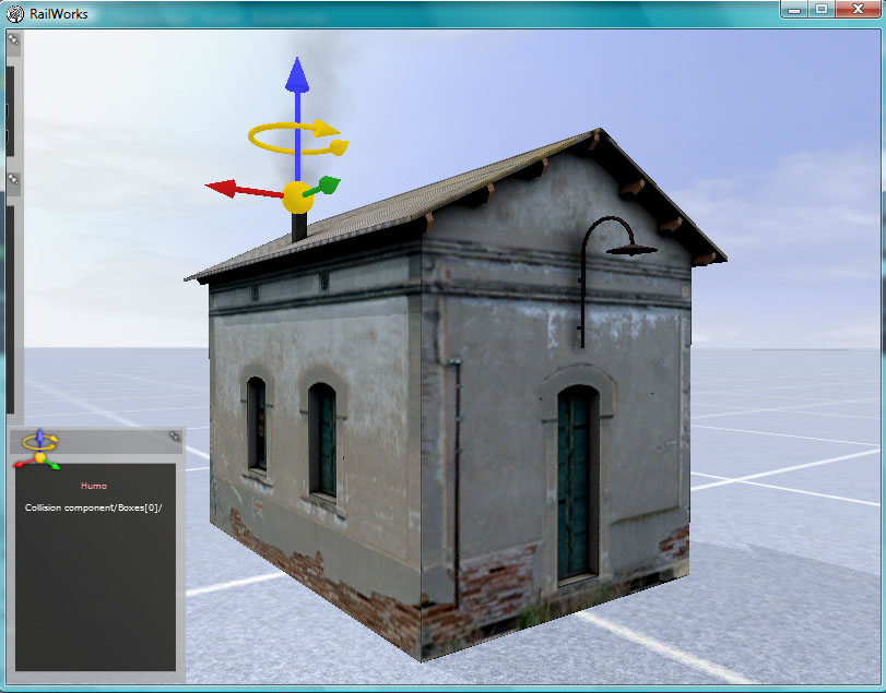 Ahora podemos previsualizar la casilla. En la ventana inferior izquierda aparecerán los objetos asociados a la casilla, entre ellos uno denominado "Humo" ;) lo seleccionaremos y nos aparecerá el "gizzmo" del objeto (las flechas esas con la bola). Arrastrando dichas flechas debemos colocar el emisor justo sobre la boca de la chimenea: