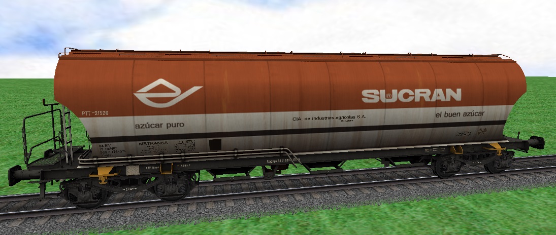 Os adjunto unas fotos de una primera exportación prueba y agradecerles desde aquí a Adrián (R_E_N_F_E), a LBA, a Blas_Dani y a Javierfl, la posibilidad de que nosotros también podamos disfrutar de las tolvas como ya lo hacen en Trainz. A petición de los autores, las tolvas serán publicadas aquí en trensim.