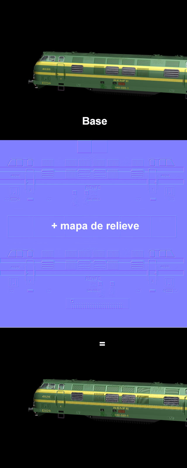 Ahora, mi experiencia con bump-mapping, en Trainz es nula, pero en otros "mundos" sí he experimentado con estas técnicas, y por eso te aconsejo que no abuses mucho...